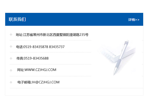 地址:常州市新北區友邦商務大廈1幢16、17層  電話:0519-85101652  傳真:0519-85112595  郵編:213022  網址:www_cz-jiayue_cn.yzjcqd.com  郵箱:xiajifengaa@163.com